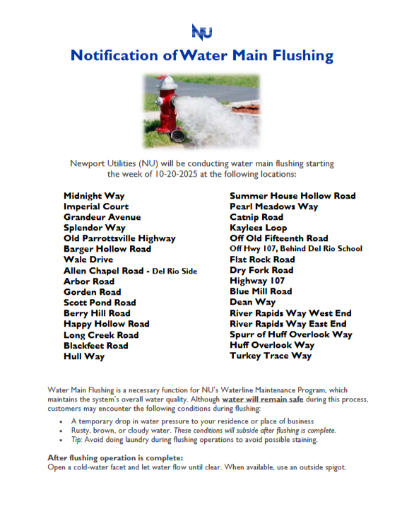 Newport Utilities has begun Water Main Flushing this week in Cocke County. Water Main Flushing is a necessary function for Newport Utilities’ Waterline Maintenance Program, which maintains the system’s overall water quality. Although water will remain safe during this process,